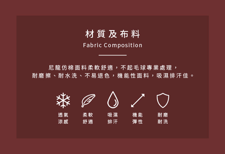 尼龍仿棉材質,吸濕排汗不黏膩