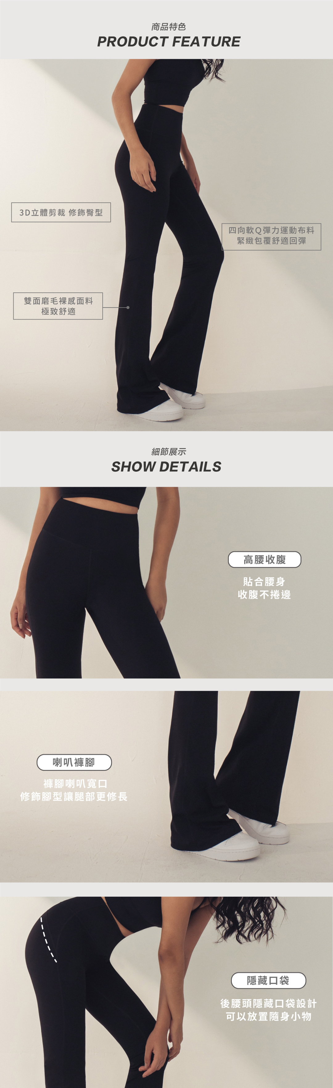 從小腿一路滑順到褲腳喇叭設計