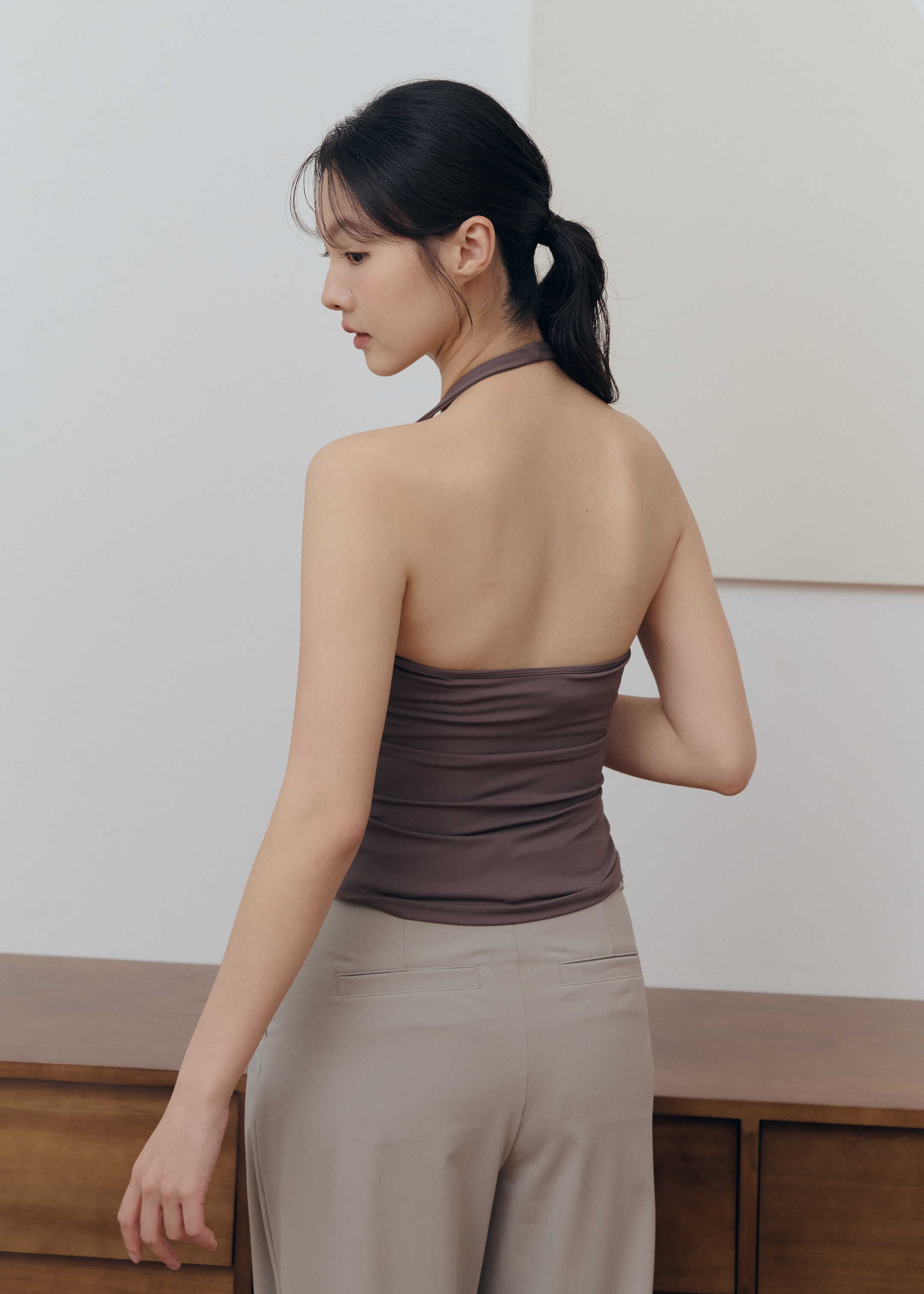 背面則是掛脖露背剪裁,完美展現背部線條且不勒頸部,